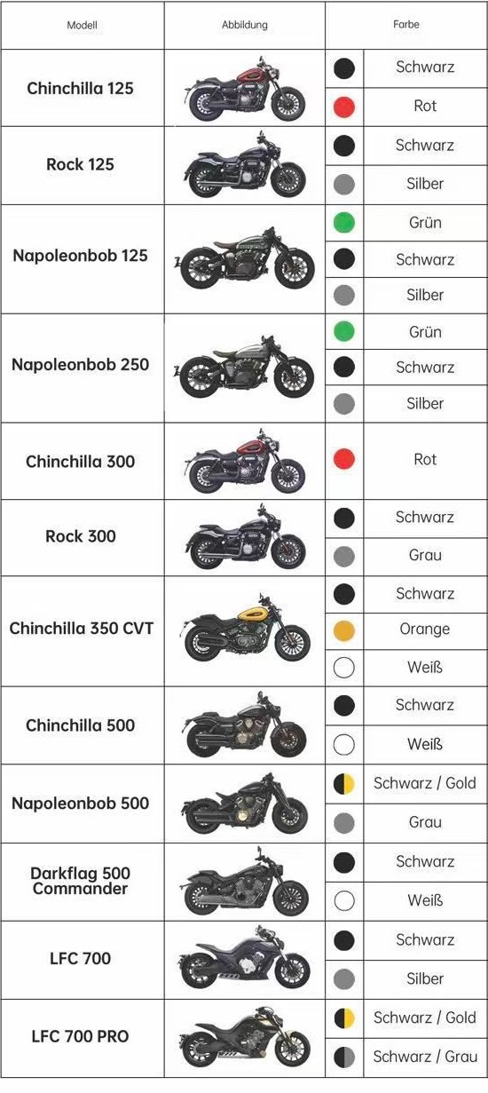 Die neue Chinchilla 125 von Benda ist ein Cruiser im Bobber-Style, der mit einem flüssigkeitsgekühlten 4T V2-Motor (2 Zylinder, 8 Ventile) ausgestattet ist. Sie bietet eine niedrige Sitzhöhe und moderne Technik in hoher Qualität. Merkmale sind unter anderem das 120/80-16 Vorderrad, das 150/80-15 Hinterrad, ein Riemenantrieb, eine 300mm Bremsscheibe und vorverlegte Fußrasten. Optisch kaum von größeren Hubraumklassen zu unterscheiden, ist sie auch in 300ccm oder 500ccm erhältlich und für den kleinen Führerschein geeignet. Der Bobber-Stil wird durch Details wie eingekürzte Fender und Retro-Rücklichter abgerundet.